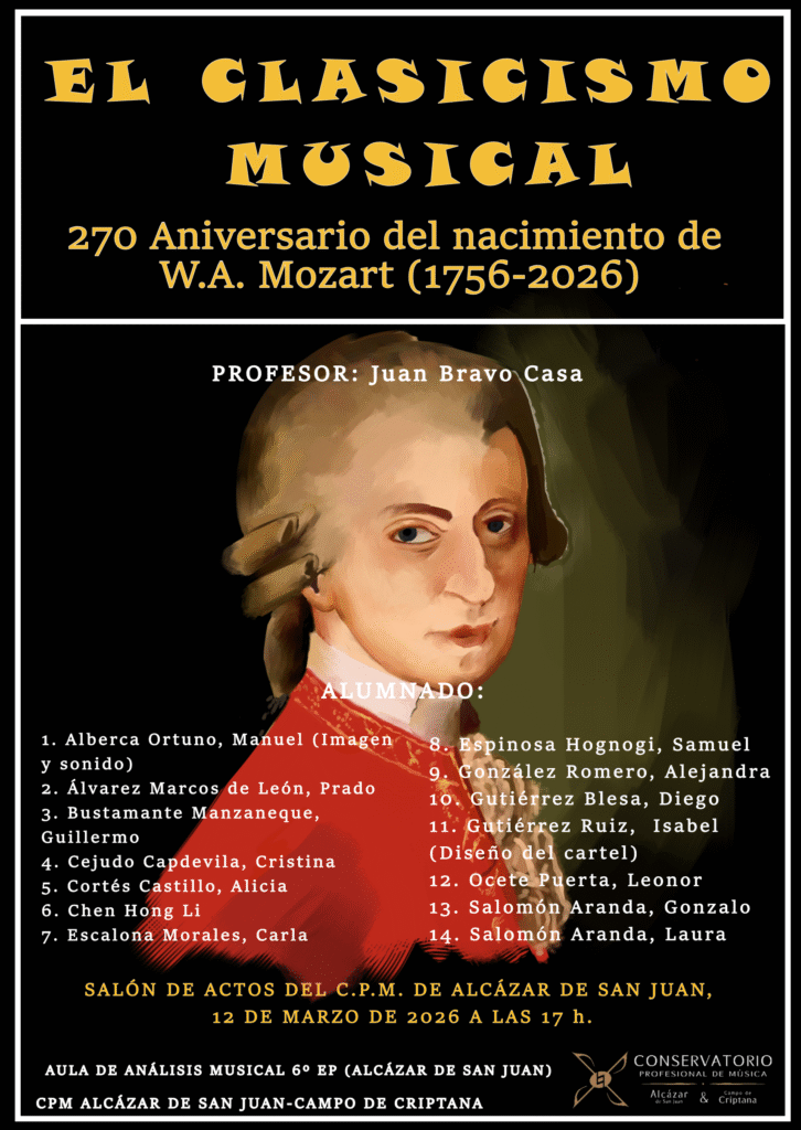 En 2026 se conmemora la efeméride del 270 ANIVERSARIO del nacimiento de W. A. MOZART . Por tanto, la actividad organizada desde el D. de COMPOSICIÓN, por el alumnado del aula de análisis musical DEL CURSO 6º de las E. Profesionales de la Sede de Alcázar de San Juan, versará sobre el Clasicismo Musical focalizado en la figura de W.A. MOZART. La actividad consta de 3 partes: