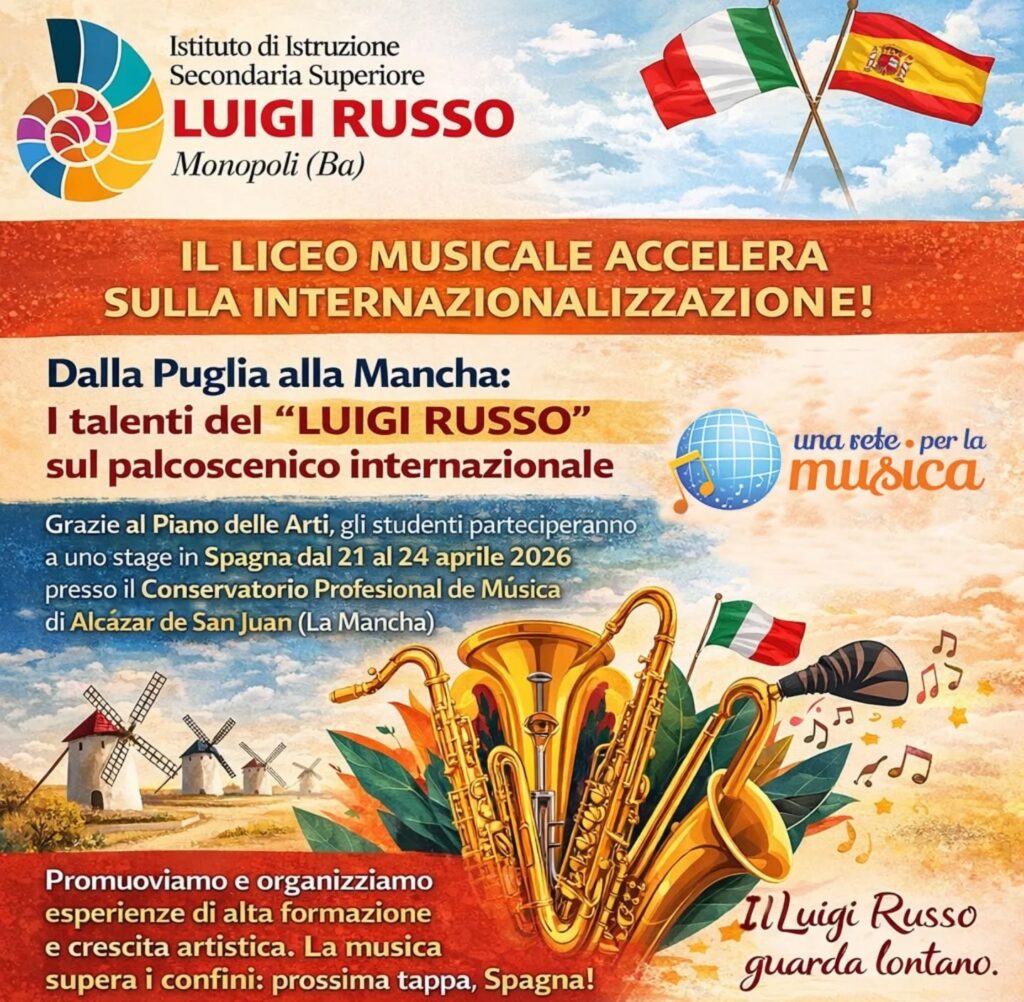 El próximo día 21 de abril de 2026 a las 19:30 horas celebramos un concierto muy especial en el Teatro Auditorio Emilio Gavira de Alcázar de San Juan. Nos visita la Banda del “Istituto di Istruzione Secondaria Superiore LUIGI RUSSO” de Monopoli, Bari (Italia).