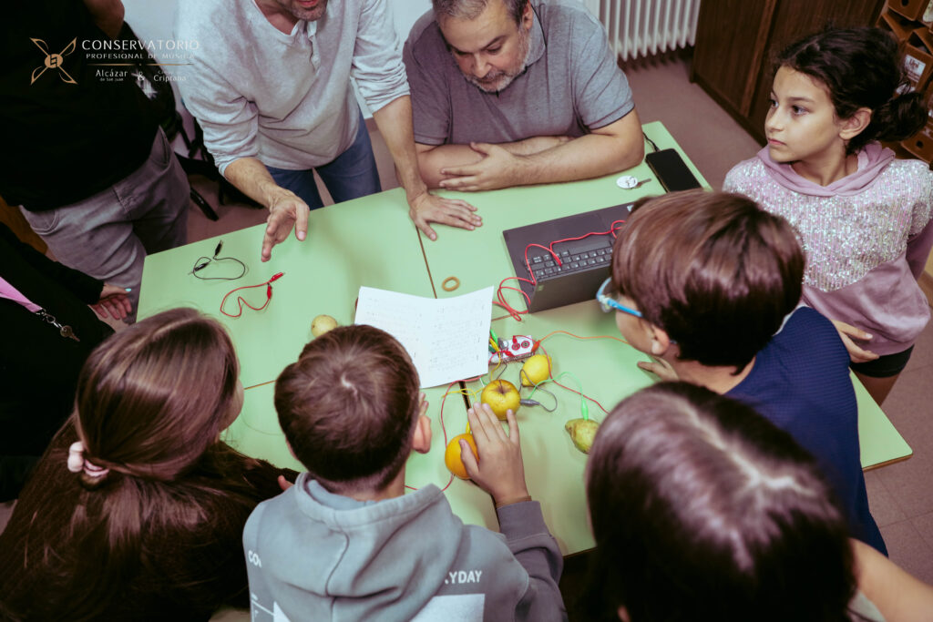 La verdad es que pasamos una tarde estupenda, gracias a los profesores que quisieron ayudar en el taller, como Laura, la profe de Lenguaje, Dani Vargas de piano, Diego Álvarez de violonchelo, o Elías, también profe de Lenguaje; además de contar con la ayuda de Fran Anquela, que nos ayudaba con todos los «cacharritos».