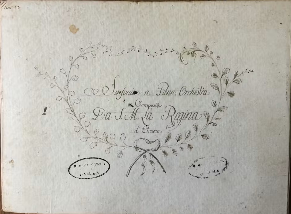 – Portada de la Sinfonía a piena orchestra (María Luisa de Borbón – Reina de Etruria) Biblioteca Palatina de Parma, Fondo Borbone.